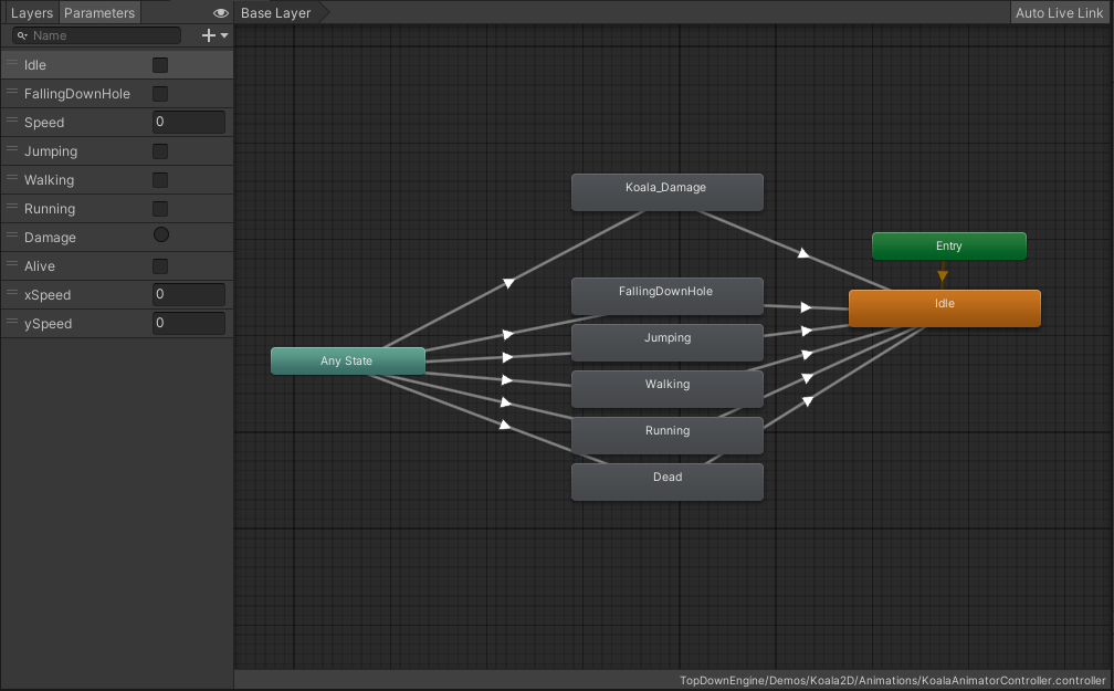本記事では、TopDown Engine を使っている方向けに、Demo に含まれる Koala キャラクターを例に各アニメーションがどのように切り替わっているか を順を追って解説します。
