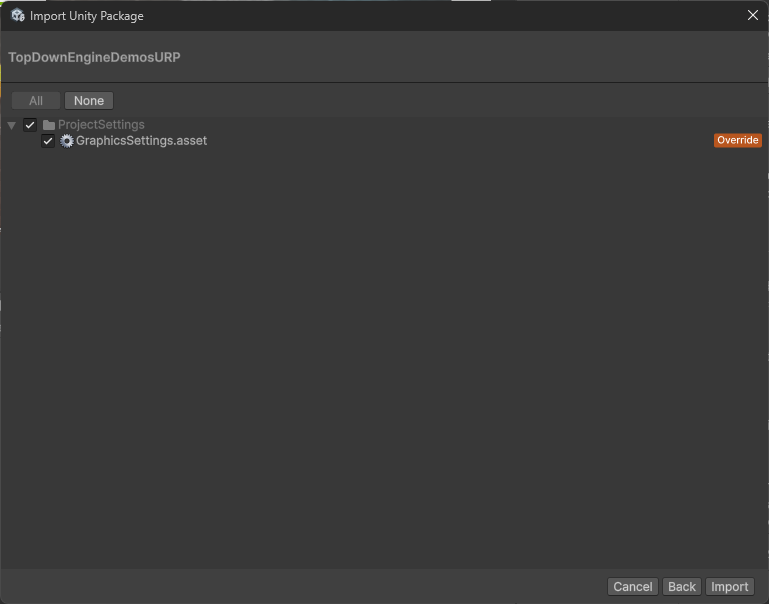 この状態から、URP用のComplete Project(デモ)を展開します。(基本的にはTopDownEingeをImportした直後の状態にやるのが好ましいです)