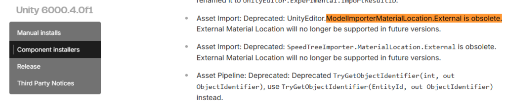 公式リリースノートを見ると以下のように「ModelImporterMaterialLocation.External is obsolete.」とありました。
